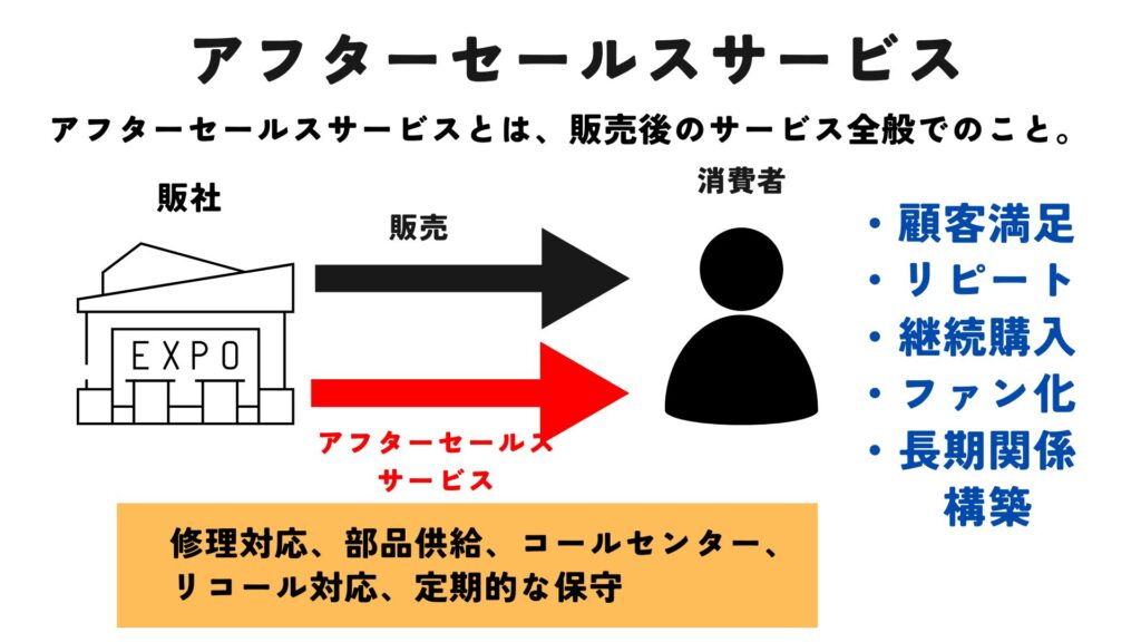 このアフターセールスサービスには、修理対応、部品供給、コールセンターでのサポート、リコール対応、定期的な保守・メンテナンス、IoTを活用したスマート診断などが含まれます。つまり、製品を売った後にも顧客との接点を継続して持つことができる重要な機会となるのです。