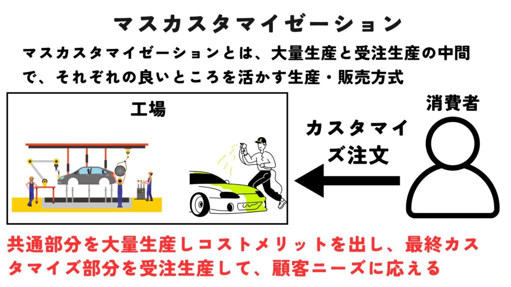 従来の大量生産では、同じ製品を大量に作ることでコストを下げることができますが、多様化する顧客のニーズに応えるのは困難です。一方、オーダーメイドは個別の要望に応えることができますが、コストが高くなり、生産効率も下がります。