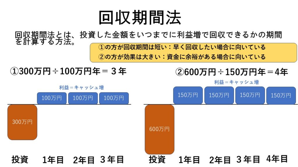 しかし、回収後の収益を考慮すると、月に利益が10万円増える投資と、20万円増える投資を比べると、当然20万円の方が収益性が高い投資となります。このように、回収期間法では投資の効果の大きさを評価しない点に注意が必要です。