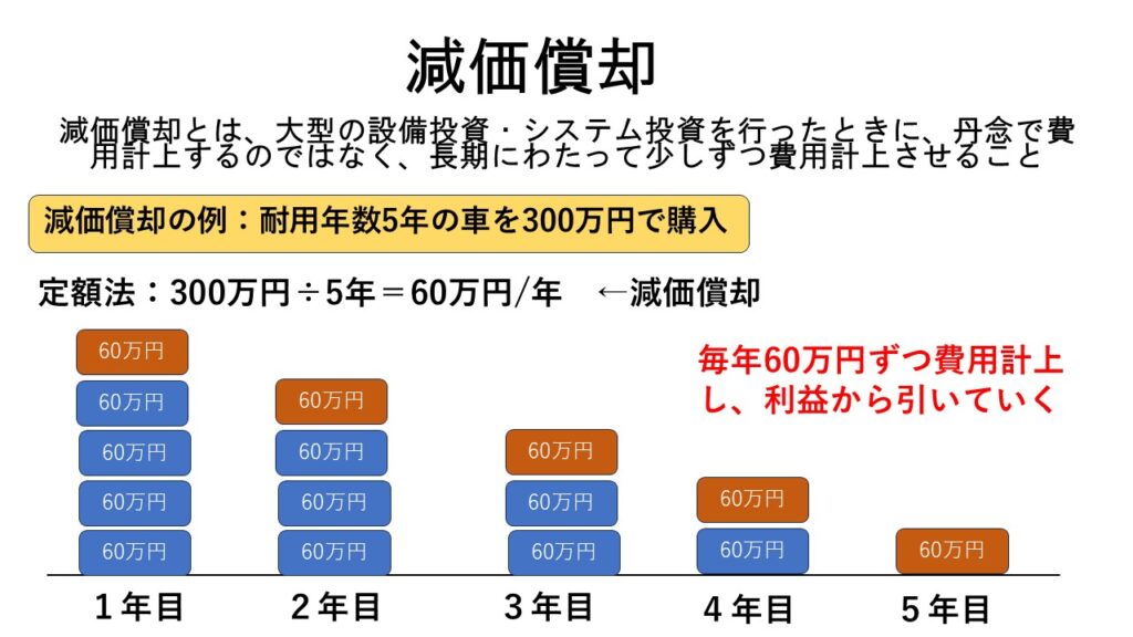 例えば建物だと15年など、長期にわたって費用として計上することができます。