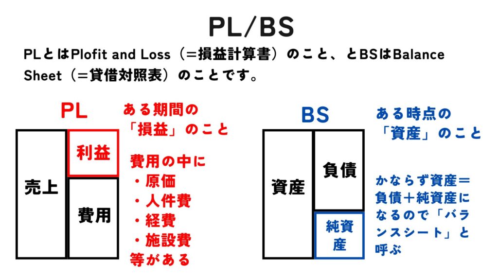 PLとはPlofit and Loss(=損益計算書)のこと、BSはBalance Sheet(=貸借対照表)のことで、「お金の流れ」や「企業の健康状態」を見るためにとても大切な資料です。